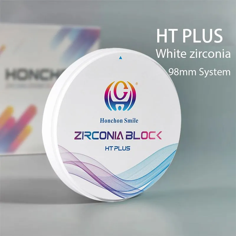 دیسک زیرکونیای سفید HONCHON 98×14 HT برای تولید ترمیم های دندانی پایدار و قابل اعتماد مانند تاج و بریج طراحی شده است. با مقاومت خمشی در اطراف1350 مگاپاسکالو شفافیت حدود40%، برای ترمیم های خلفی و پل های بلند- مناسب است.